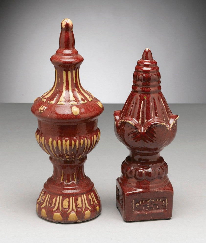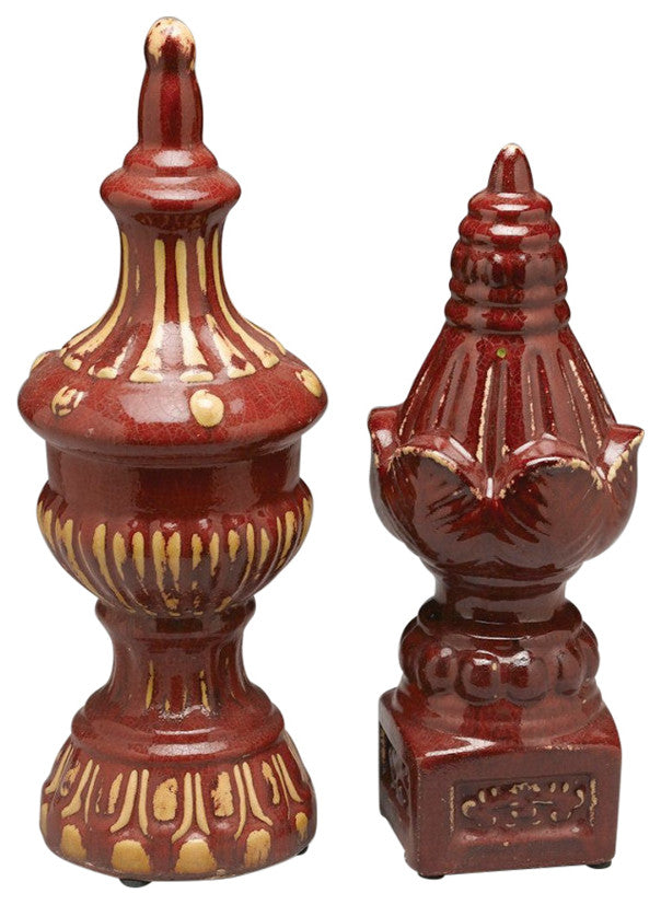 Trust the 16" Ceramic 2-Piece Urn Set to complete your display cabinet. Place this atop your desks or shelves for decor. It features two finials of different sizes brimming with antique and vintage beauty. Its tall, imposing design and classy finish make it a striking addition to entryways, living rooms, or outdoor patios. This is perfect for people who are collecting decorative pieces of different designs.Features:Overall product dimensions are 6" W x 6" D x 16" HTwo red finials of different sizesVintage and antique-looking decorative pieces that bring elegance to any spaceSturdy bases makes it perfect to place atop your shelves or desksLow-maintenance and easy to cleanDimensions:Vases, Urns, Jars, and BottleAssembled Product: 6 inches wide x 6 inches deep x 16 inches high.