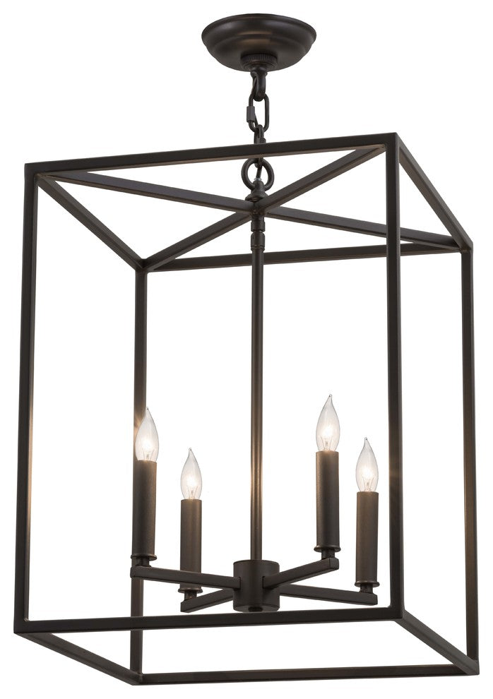 A sophisticated architecturally styled fixture is designed with a pizazz that is unique, fresh and stylish. Give your decor an extra edge with this innovative fixture, which is highlighted with a solid steel structure featured in a Wrought Iron finish. Suspended inside the frame is a candelabra with four luminaires. Handcrafted in the USA, Kitzi is available in custom sizes, styles and finishes, as well as dimmable energy efficient lamping options. UL and CUL listed for damp and dry locations.
