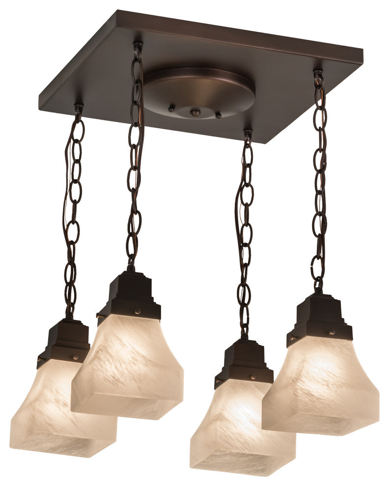 This stunning Mission styled ceiling fixture projects soft ambient light through four shapely White Alabaster Art Glass diffusers, which are complemented with handsome decorative hardware featured in a Mahogany Bronze finish. This fixture, which can be used as decorative luminaire for any room in residential and commercial settings, is handcrafted in the Meyda manufacturing facility in Upstate New York. Custom colors, designs, sizes and dimmable energy-efficient lamping options are available. UL and cUL listed for damp and dry locations.