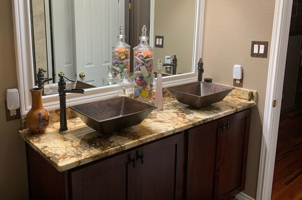 Discover the rustic charm and timeless beauty of our hand hammered vessel sinks. Individually crafted by our skilled artisans from recycled copper each sink is a beautifully designed extremely durable and one-of-a-kind piece of art ready for display in your home. 17" Rectangle Wired Rim Vessel Hammered Copper Sink Features:Configuration: RectangleDesign: Hammered Copper Surface with Rigid Copper Wrapped Wire RimColor: Oil Rubbed BronzeOuter Dimension: 17.25" x 13.25" x 5.5"Inner Dimension: 17" x 13" x 5.5"Installation Type: Vessel, Above CounterRim: Rigid Copper Wrapped WireCountertop Depth Minimum: 16" Front to BackMaterial Gauge: Industry Best (17 Gauge or .0450")Drain Opening: 1.5" Non-OverflowSuggested Drain Models: D-207ORB, D-208ORBDRAIN SOLD SEPARATELYFaucet Mounting: Vessel Counter Deck Mount or Wall MountHand Made100% RecyclableComposition: 99.7% Pure Recycled CopperLead Free (less than .01%)Patina: FiredPackaging: Recycled Cardboard BoxWarranty: Limited LifetimeCODE / STANDARD COMPLIANCE: IAPMO / cUPC LISTED BRAND: Premier Copper ProductsIMPORTANT NOTE: DUE TO THE HANDCRAFTED NATURE OF THIS PRODUCT SMALL VARIANCES IN SIZE AND COLOR MAY OCCUR.INCLUDED:Care InstructionsInstallation InstructionsWarranty InformationBathroom Sink Suggested Accessories: 1.5" Non-Overflow Grid Bathroom Sink Drain in Oil Rubbed Bronze (D-207ORB)1.5" Non-Overflow Pop-up Bathroom Sink Drain in Oil Rubbed Bronze (D-208ORB)Copper Sink Installation Silicone (C900-ORB)Copper Sink Wax (W900-WAX)