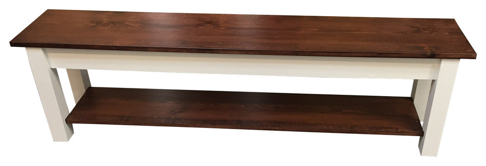 The 1776 bench has a rich Red Mahogany finished top and shelf With a white base. The dark classic color means that this bench will go With anything. This bench has a shelf built in for added functionality. It would make a great shoe rack bench for a foyer or mud room.Dimensions:12" Deep x 17" tall (multiple lengths available)Grain / Color Notice Because our furniture is crafted from solid real wood there will be variation in color, and grain pattern. Products in the images have been crafted from the same species of wood and stained with the exact same stain color as the product you will receive. However because wood is a natural product no two pieces are the same. Depending on an individual piece of wood and grain pattern the stain may take more or less resulting in the color variation. While every effort has been made to supply you with the most accurate photographic representation, you should expect some variation in your product.