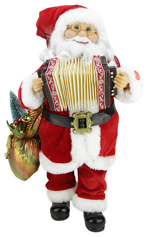 This festive figure features Santa Claus wearing his traditional red and white suit Santa hat black boots and large black belt | Santa is carrying a gold bag over his shoulder that is exploding with presents | Santa''s piercing blue eyes gold wire glasses round chubby cheeks and friendly smile will be a nice cheery addition to your Christmas decor | Atop Santa''s red hat is a real jingle bell that makes a pleasing jingle sound when moved | Recommended for indoor use | Product Features: | Animated - In Santa''s hands is an accordion when the item is on Santa moves the accordion bellows in and out | Musical - when you press the button on Santa''s hand you will hear the music for some of your favorite Christmas tunes | Songs include: Silent Night Deck the Halls Joy to the World The First Noel Hark! The Herald Angels Sing O''Christmas Tree Jingle Bells and We wish you a Merry Christmas | Battery Operated - requires (3) "AA" batteries (not included) | Battery pack hides underneath Santa''s suit in the back and has an on/off switch on the pack | Convenient on/off button on the side of Santa''s hand | Dimensions: 18"H x 10"W x 8"D | Material(s): plastic/fabric/faux fur/metal