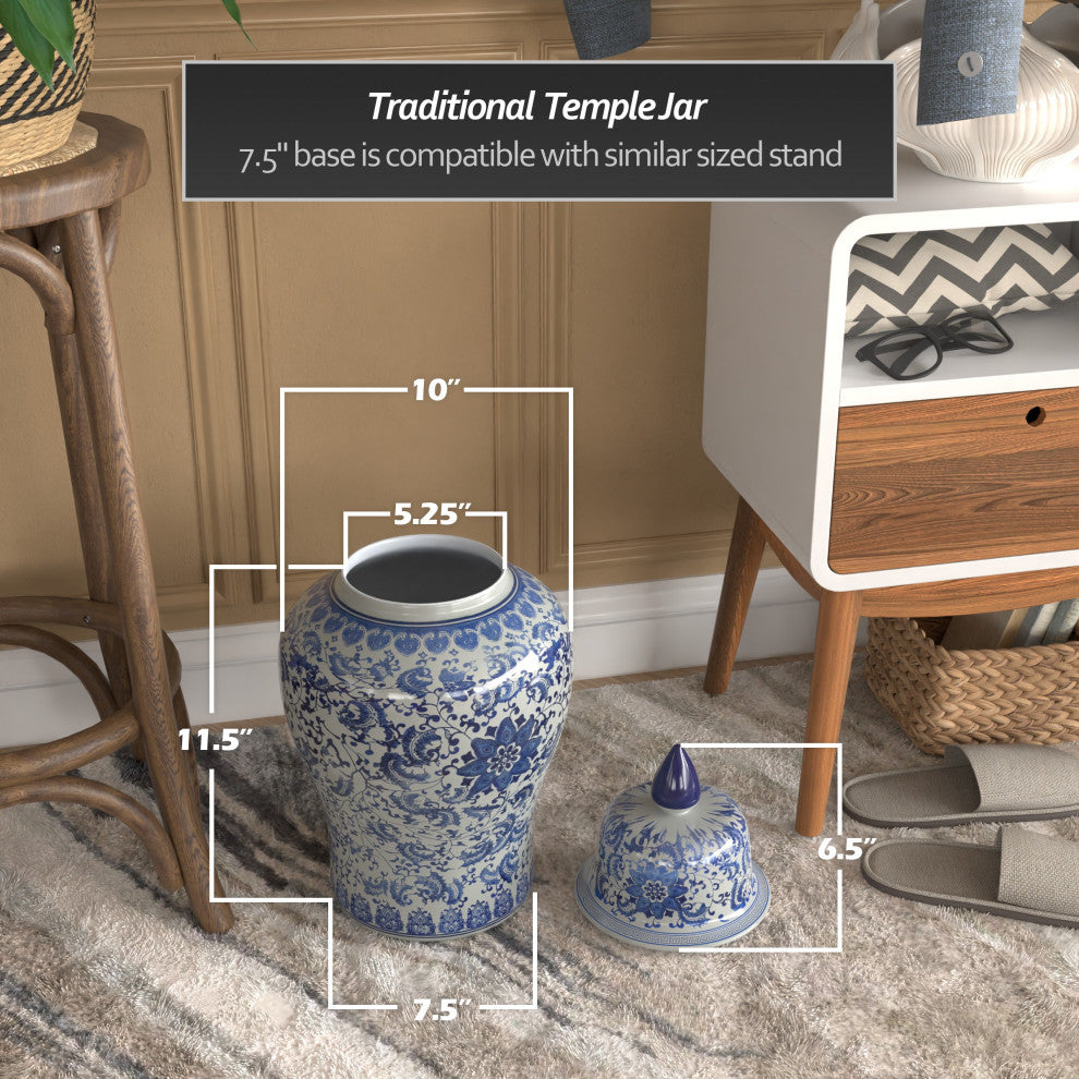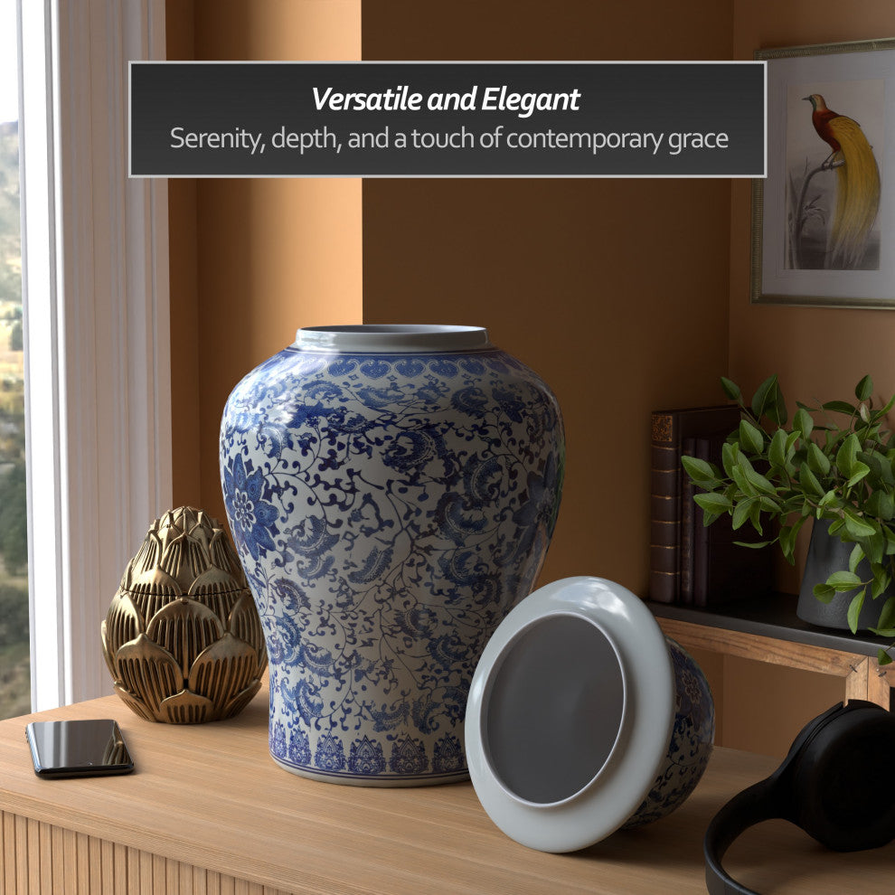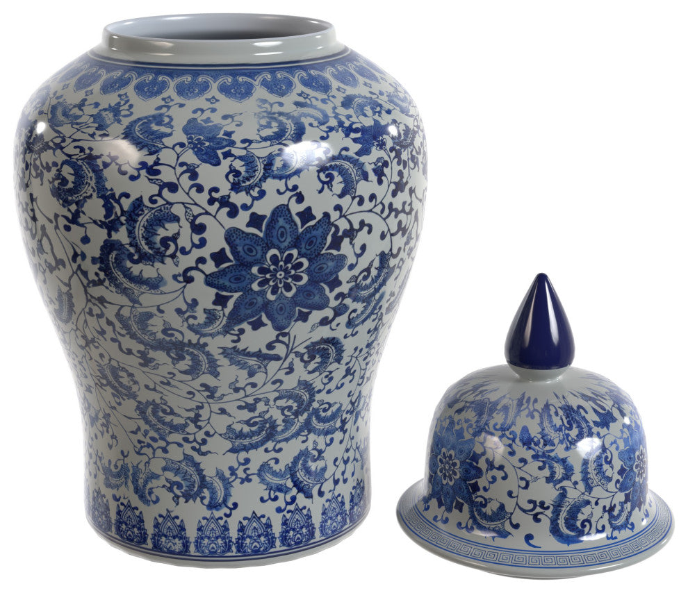 Traditional Oriental Temple Jar: Elevate your decor with this elegant piece inspired by ancient Chinese artistry. The jar features a removable lid, offering convenient storage space while adding a touch of cultural sophistication to any room