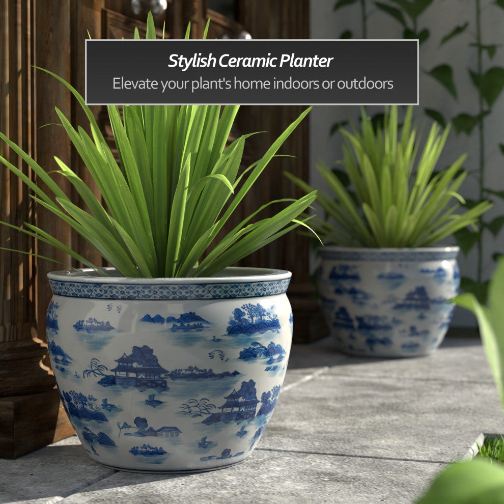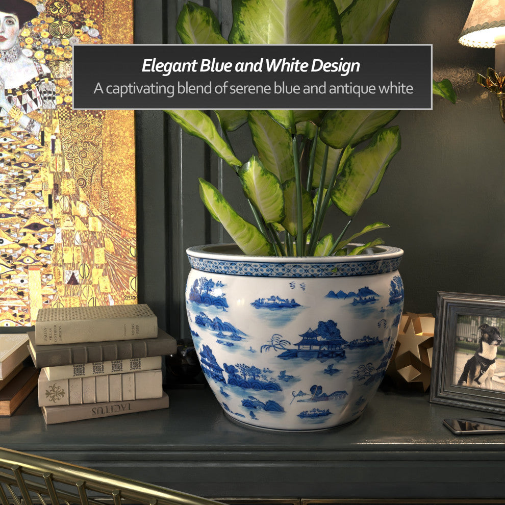A classic Asian fishbowl, decorated with a fine Ming oriental landscape pattern with mountain pagoda accents. The rich blue pattern against white China suits traditional European decor as well as contemporary American interior design. Large enough for live indoor tree species like Fichus or Avocado, as well as silk trees or dry flower arrangements.Handmade Blue & White Chinese Landscape: Tranquil mountains, islands, and sea painted in classic blue & white. Timeless, serene, and versatile for a touch of traditional charm in your space.Chic Large Cache Pot: Elevate your plant''s home indoors or outdoors with this stylish design. 14.25" wide opening ideal for inserting a planter since there is no drainage hole. Its 11.25" base is compatible with similar sized stand.Traditional Craftsmanship: This was made by hand in a small workshop by a traditional artisan employing centuries of knowledge and cultural heritage. Each piece is a unique work of art and may vary slightly in exact design and detail.Modern High-Temperature Firing: This exceptional ceramic boasts a vitreous porcelain finish achieved through firing in a state-of-the-art high-temperature kiln. Its strength and durability ensure a top-quality, reliable product for all your needs.Classic Design for Today''s World: By supporting traditional artisans in a changing world you help keep their crafts alive and available. These vanishing arts are precious and make a beautiful gift for a birthday, anniversary, housewarming, or holiday.