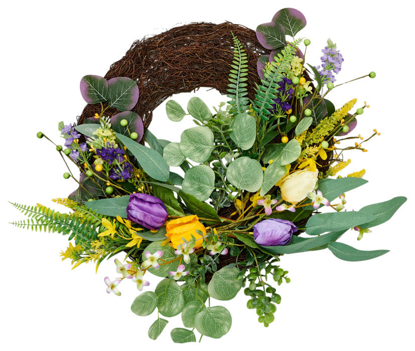 This pretty wreath features a beautiful combination of bright colorful tulips. It is also detailed with berries and green leaves sitting on a half grapevine wreath. Perfect for any door or wall.