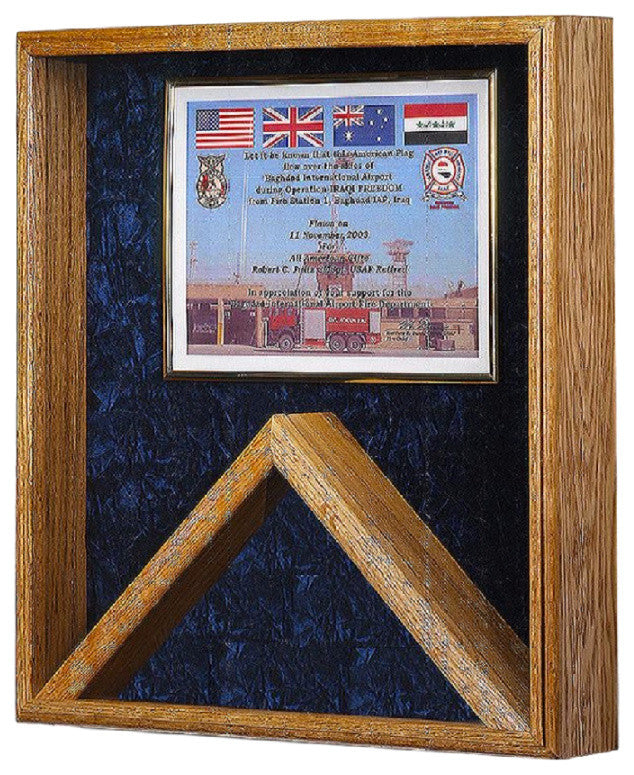 Flag and certificate combination case for a 3''x5'' flag and standard size (8.5''''x11'''') certificate. Solid oak wood. 18"x20"x3". Blue Crushed velvet background. Wall hangers included. 100% made in the USA! • Please see secondary image for background color. Engravings are NOT included.