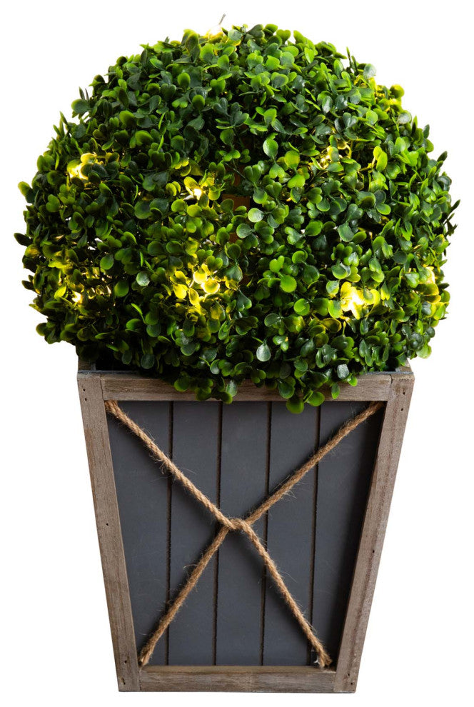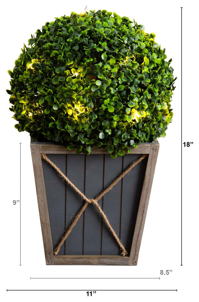 Brighten any space with our Artificial Boxwood Topiary Ball, a verdant year-round delight. This UV-resistant piece is illuminated by 20 energy-efficient LED lights, (battery operated, 3 x AA batteries not included), adding a cozy twinkle to your favorite nook, indoors or out. Created by expert horticulturists using top-tier materials, it''s a burst of everlasting greenery that won''t fade away wherever displayed. Feel free to simply unbox, fluff and place in the space of your choice. At a versatile 18 inches from a decorative planter and safe for outdoor use, it''s the ideal green companion to light up your home or garden with an elegant, maintenance-free touch. Let this boxwood beauty be the evergreen heart of your decor, day in and day out.