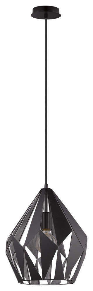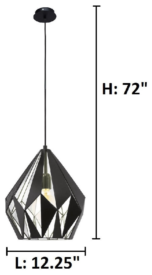 The Carlton 1 Pendant by Eglo has a modern geometric shape with a reflective interior. The unique fixture is sure to bring compliments and be the discussion piece among guests. The quality of the fixture is built to last.PendantGeometric PendantProduct Dimensions: 72"H (Diameter: 12 1/4")Shade Dimensions: 12 1/4"W x 15"H x 8" BottomShade Material: MetalShade Color: Black/SilverShade Shape: DomeShade Included: YesCanopy Measurments: 4 1/2" D x 1" HNumber of Bulbs Required: 1 Bulb(s)Bulb included: NoType of Bulb: A19Wattage: 60W (1x60W)Voltage: 120VBulb Shape: A19Bulb Base: E26Material Fixture Made of SteelBase Material: SteelFixture Finish: Black & SilverCable Color: BlackIs Mounting Hardware Included: YesAssembly Required: YesScratch Resistant: NoRust Resistant: NoHardwiredSloped Ceiling Adaptable: YesMulticolor-Changing LED: NoField Cuttable Cord, Dimmer Compatible (Not Included)UL WET/DAMP LOCATION: DryLighting Type: ETLRoom Use: IndoorsWarranty: 1 Year