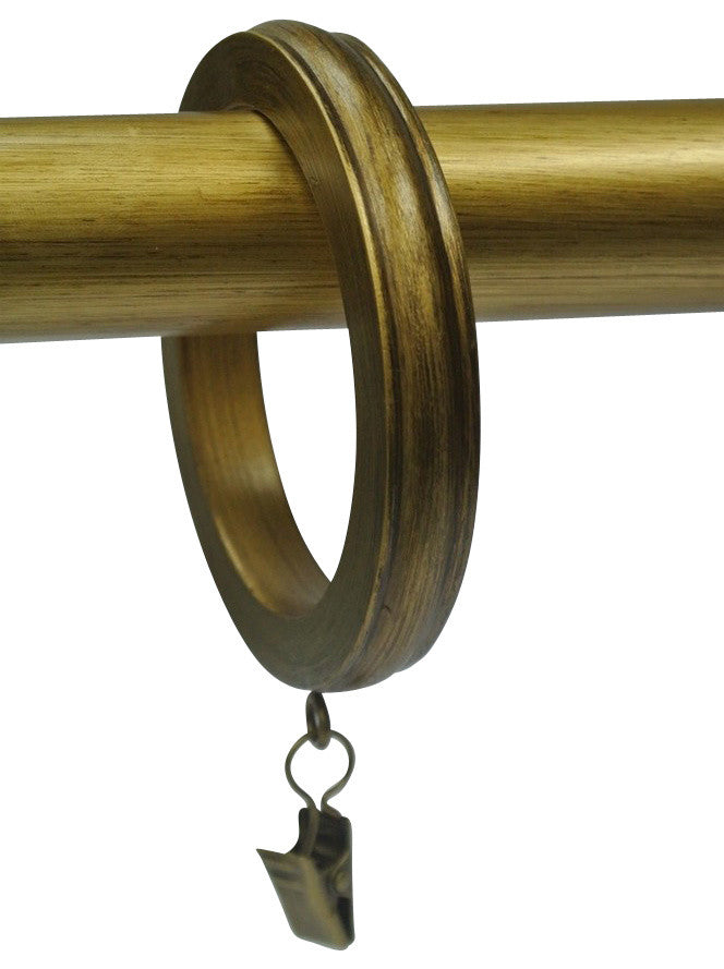 Curtain rings are a necessity, but that doesn''t mean that they have to be boring. These designer curtain rings have clips to attach to drapery panels and are made of polyresin. The ring has an inner diameter of 2 1/2"and an outer diameter of 3 1/2". The maximum recommended curtain rod size for this ring is 2". Available in 4 finishes: burnt gold, renaissance gold, pewter, and ivory.