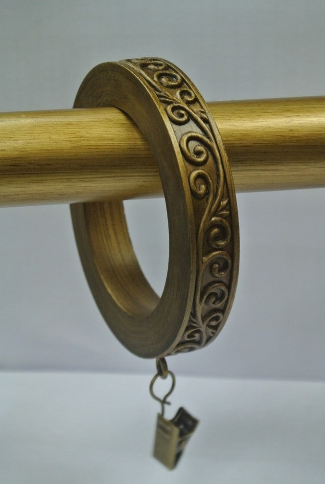 Curtain rings are a necessity, but that doesn''t mean that they have to be boring. These designer curtain rings have clips to attach to drapery panels and are made of polyresin. The ring has an inner diameter of 2 1/2"and an outer diameter of 3 9/16". The maximum recommended curtain rod size for this ring is 2". Available in 4 finishes: burnt gold, renaissance gold, pewter, and ivory. The scroll design is found on the outer edge of the ring.