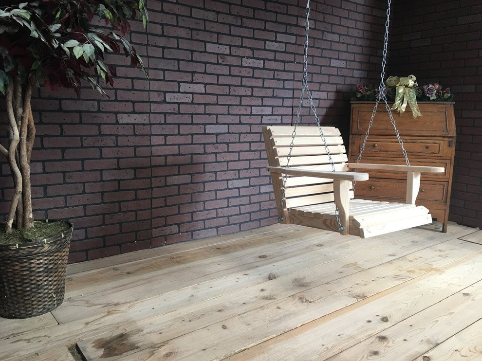 These are beautiful Cypress Porch Swings built to last with quality and pride, hanging chains included. 100% hand crafted from cypress lumber (The Eternal Wood). Our slats are 1 inch thick and 1 3/4 inches wide reuttered (no sharp edges) and finish sanded on all sides and ends for your safety and comfort . Large very sturdy heavy duty frame. The slats are screwed (NOT STAPLED) to the frame and the frame is bolted together with 5/16 inch bolts the bottom of the swing is beautifully contoured for your sitting pleasure. Our swings come unfinished and may be left unfinished to weather to a beautiful barn wood grey, or decorate as you choose. We use galvanized and zinc plated hardware which are rust resistant. Cypress is known as the "Eternal Wood" it is naturally insect so you do not have to paint, stain or water seal it if you choose not to. • See second image for correct color.