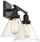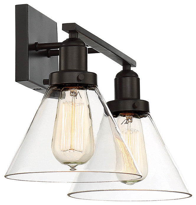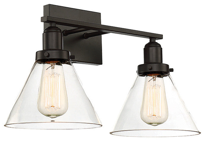 This 2-light bath bar has an alluringly simple style with a few choice hardware details and shades of clear glass. It may be mounted as either uplight or downlight. Bath bar lights are a classic choice for illuminating vanity mirrors in bathrooms big and small. Because the bulbs are exposed, try using stylized bulbs (not included) such as Edison for a different look! The English bronze finish can be paired with bronze hardware or mixed with hardware in other fixtures. Add to industrial, transitional or contemporary rooms for a bold look.