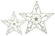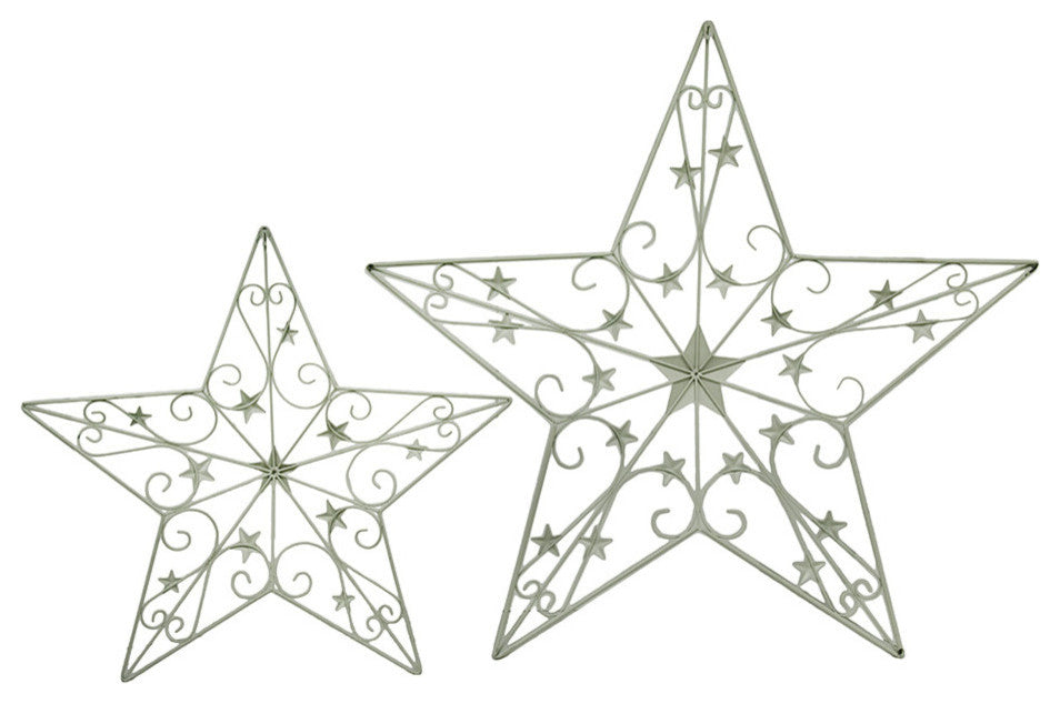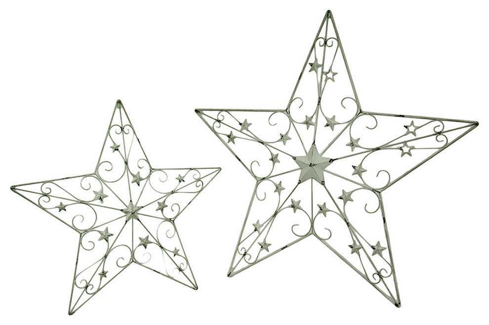 This two piece set of decorative metal star wall art is crafted in a scrollwork design with star details that give it a light and folk art type feel. The white, rustic finish contains generous specks of black which gives the pieces an antique, vintage vibe. They come ready to be mounted from a single nail or by a ribbon. Alternatively, you can set them on a table or mantelpiece, and surround them with other design elements such as candles or string lights. They will fit in with a variety of decors but will look especially great in a country style. Perfect for a porch or patio that has white wicker or metal furniture.