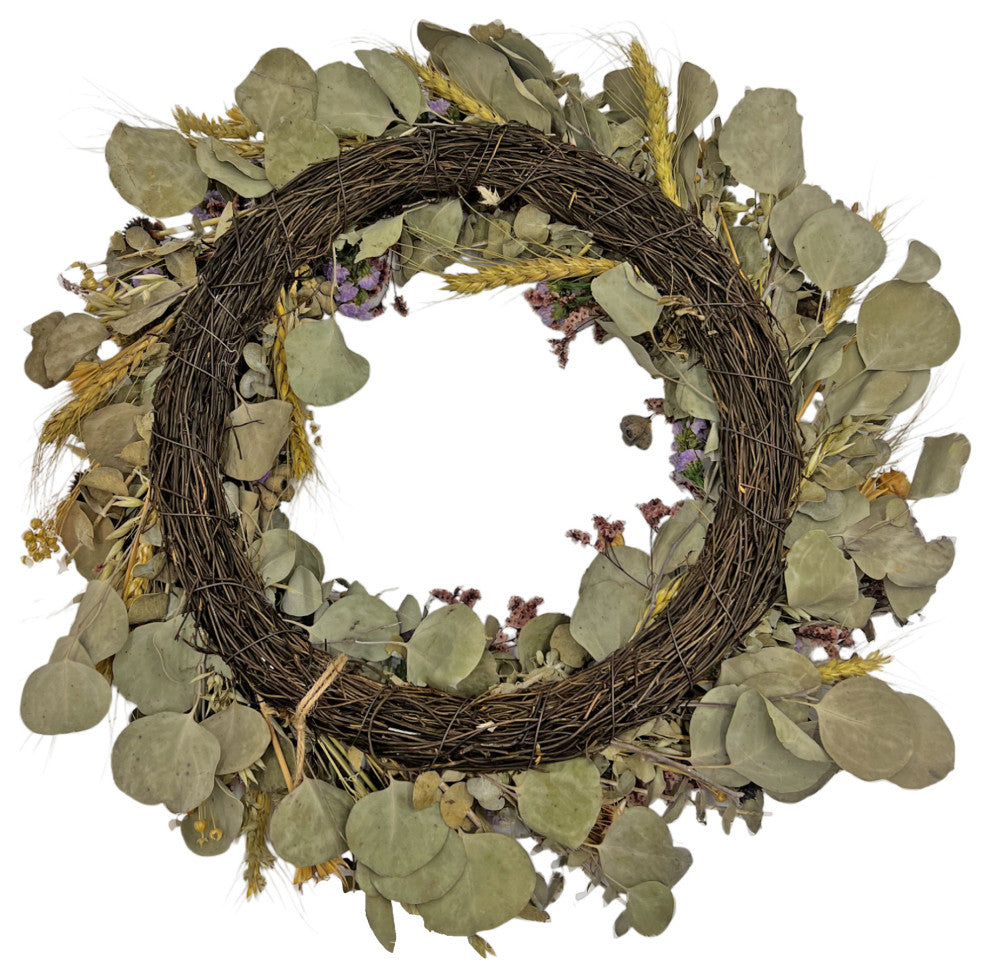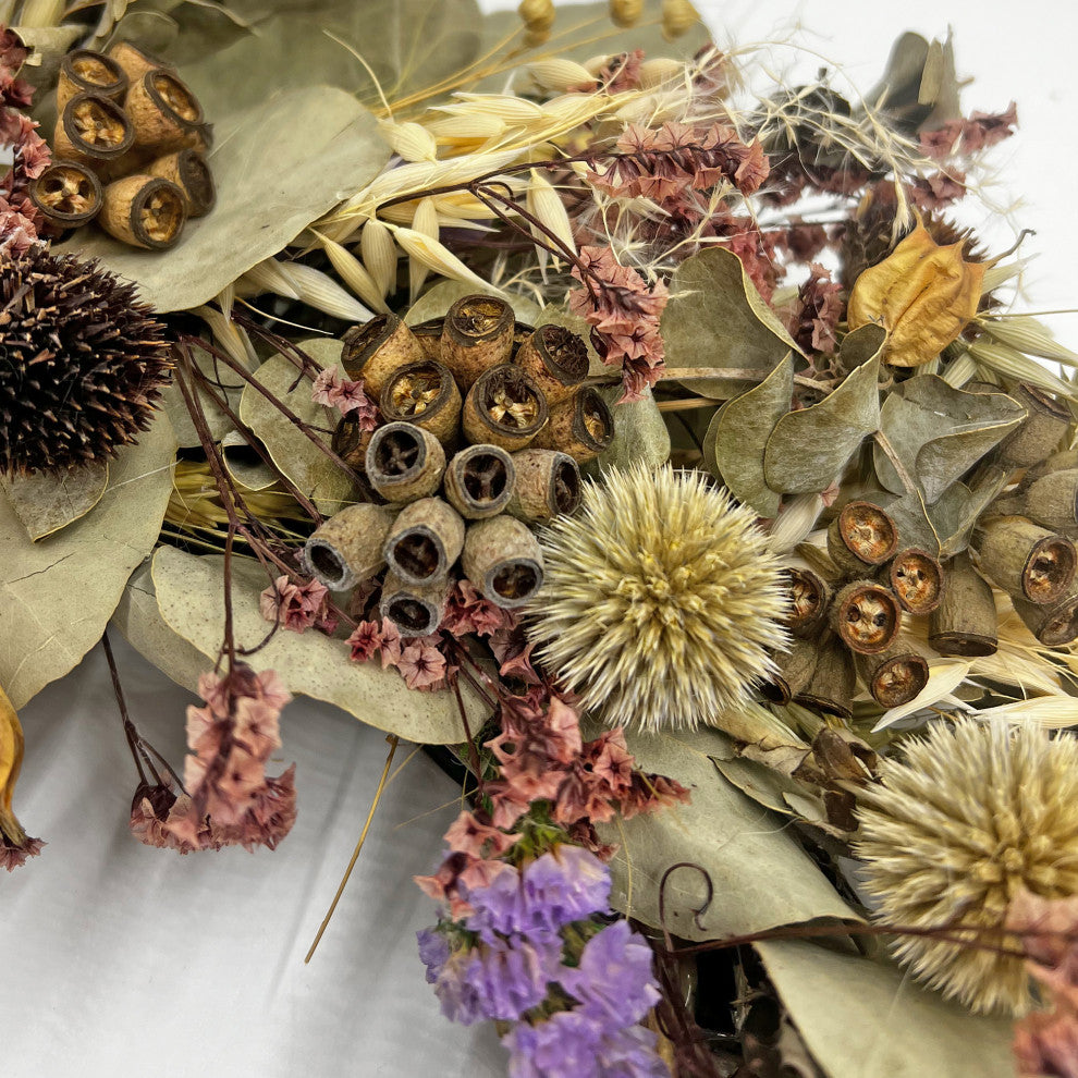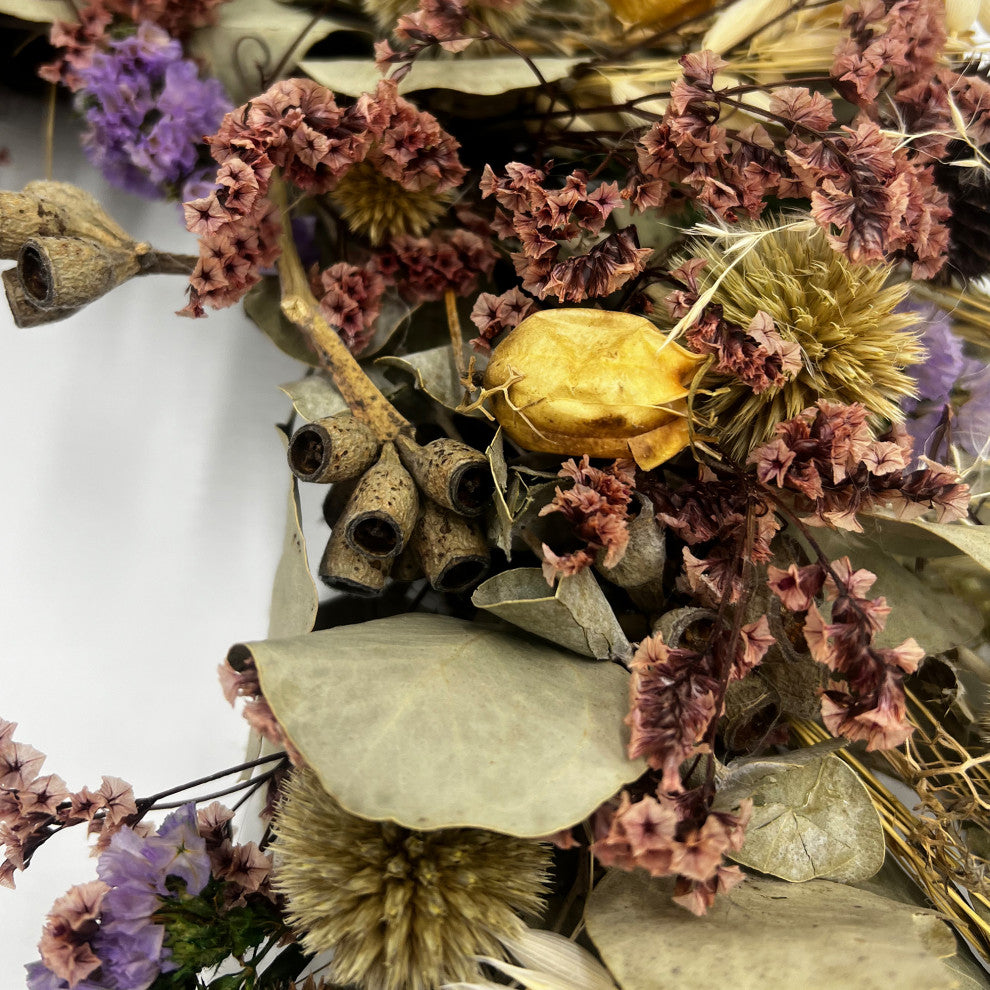 Made with eucalyptus, oat, pampas grass, wheat, and love-in-a-mist