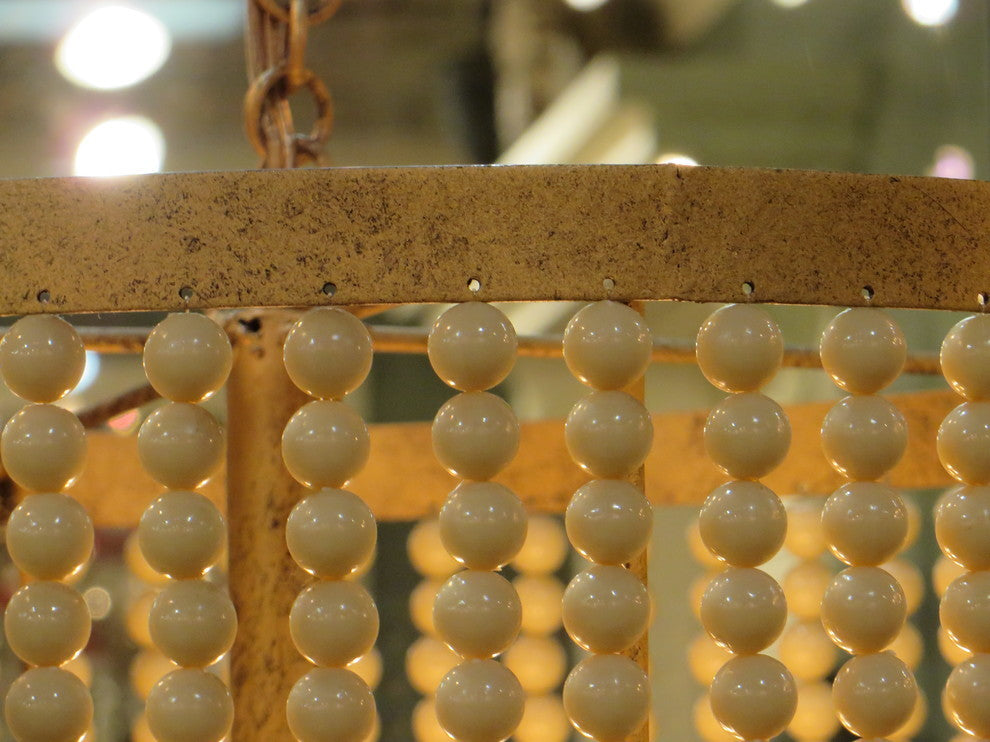 Lavishly elegant, our beaded wall sconces and chandeliers are the perfect way to add romantic lighting to a room. Embellished with strands of resin cream beads in graduated sizes. Iron frame has antiqued brown gold finish. Uses six max 40 watt bulbs (not included), UL approved, Hard- wired. 36" chain and ceiling canopy included. Coordinates with our other Cream Beaded Lighting, available separately. Size: 15'''' H x 20'''' W x 20'''' Deep Weight: 11. 2 lbs. Heirloom Quality - Expertly hand crafted and hand finished Due to the hand crafted nature of this piece, each piece may have subtle differences.