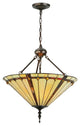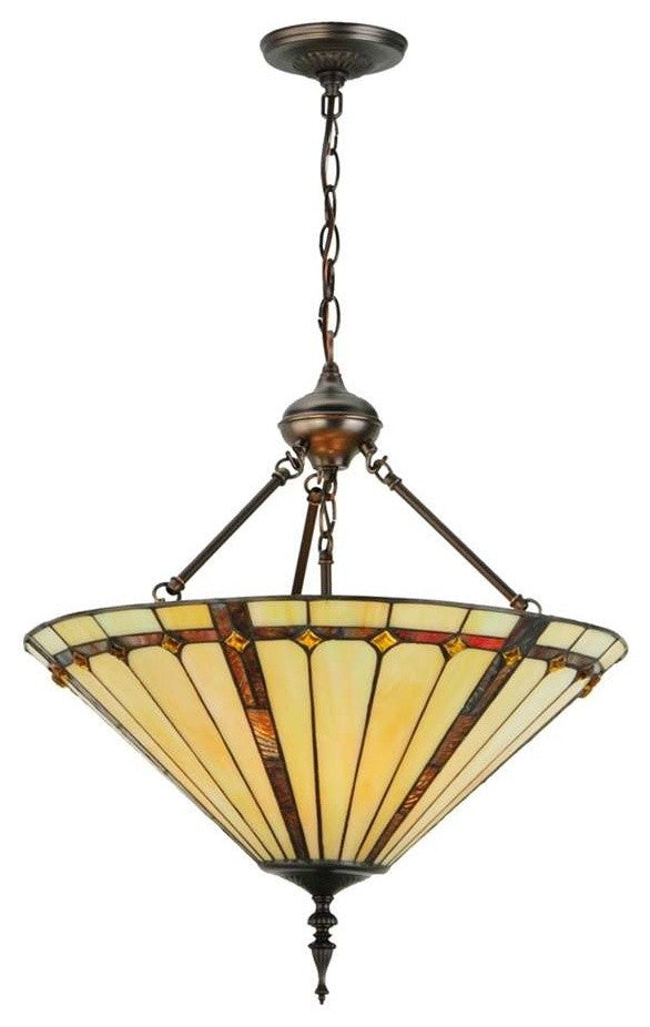 Exquisite Purple and Sunburst colored trim with Amber jewels adorn Beige Iridescent glass on this conical inverted pendant. This stunning shade is constructed with Meyda Tiffany''s famous copper foil construction process. The hardware is finished in a warm Mahogany Bronze.