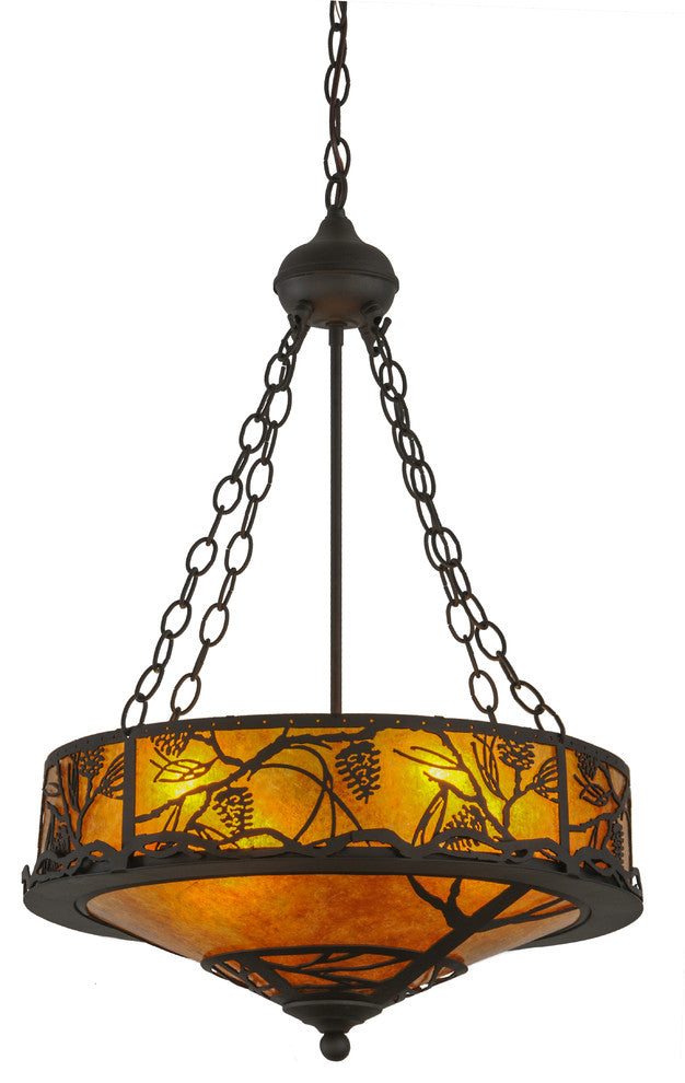 Listen closely. You can almost hear the soft whisper of the pine branches as they dance in the wind. Enjoy the warm ambiance of soft beautiful light diffused through this rustic pendant s Amber Mica featuring stunning pinecone and pine branch designs. Hand finished in handsome Oil Rubbed Bronze and handcrafted by Meyda Artisans in Yorkville, New York. Create the design, colors, and the size and style of your choice. Energy efficient lamping options available.