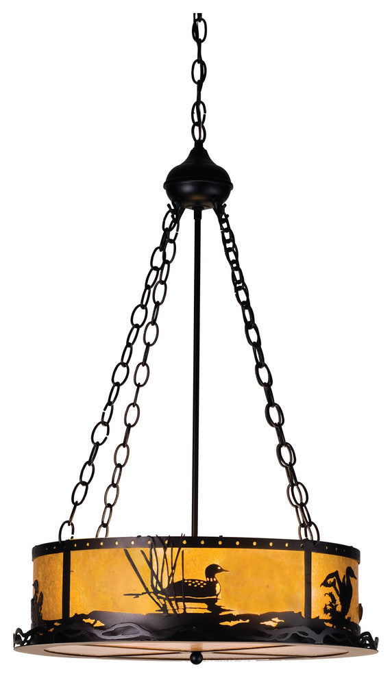 Stunning images of aquatic birds floating on a lake captured in this wildlife inspired Amber Mica fixture which diffuses beautiful ambient light, with a Silver Mica diffuser on bottom of fixture. The lens is complemented with a frame and hardware hand finished in Black. Handmade by Meyda Craftsmen in the Yorkville, NY manufacturing facility. Custom colors, styles and sizes available. Energy efficient lamping.