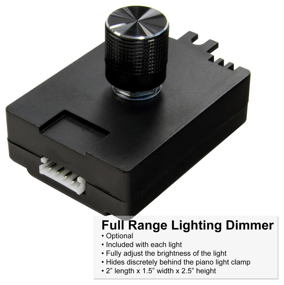 Cocoweb designed its 22" LED Grand Piano Lamp with the needs of pianists in mind: this elegant light is crafted to accent grand pianos in rich style, utilizing a system of advanced LED nodes to warmly illuminate your musical movements. Handcrafted EleganceShowcasing the classic lines and cut from the highest quality brass and aluminum, the 22" Grand Piano Lamp has a matte powder-coated finish that ensures a lifetime of use: Cocoweb Grand Piano Lamps are handcrafted, with each light rolled, polished, buffed, sprayed and inspected to make sure every individual light is a masterpiece. Available in Black, Antique Brass, Mahogany Bronze, and a special Black with Satin Nickel accents variation, this lamp is a sophisticated accent to grand pianos of all styles.Advanced LED TechnologyThis lamp comes equipped with an LED array for a rich lighting experience. Each diode has a warm color temperature of 2700 Kelvin, an illumination comparable to natural sunlight. In fact, this warm illumination reduces eyestrain in comparison to traditional light bulbs, allowing you to play in comfort for longer periods of time. And with an average lifetime of 50,000 hours, the 22" Grand Piano Lamp is sure to provide vivid lighting for years to come. Stylized Piano LightingEach lamp includes a Cocoweb Electronic Dimmer, enabling you to set the brightness to your desired taste. The dimmer plugs in directly to the back of the lamp with a 5 inch cord, easily accessible no matter where you mount the light. In addition, the lamp is powered by a 10 foot wall adapter with a discrete ultra-thin cord, allowing plenty of roaming space.High-End VersatilityDon''t be fooled by this lamp''s simple design: not only is the felt-lined clamp able to be fitted to most music stands without any damage, but the shade is separated into two bi-rotational portions that can bend inward, outward, and side-to-side. The height of the lamp is also easily adjusted, suitable for sheet music and music stands of any size. No matter your set-up, the Cocoweb 22" Grand Piano Lamp is able to rotate and adjust for the perfect angle to your playing!