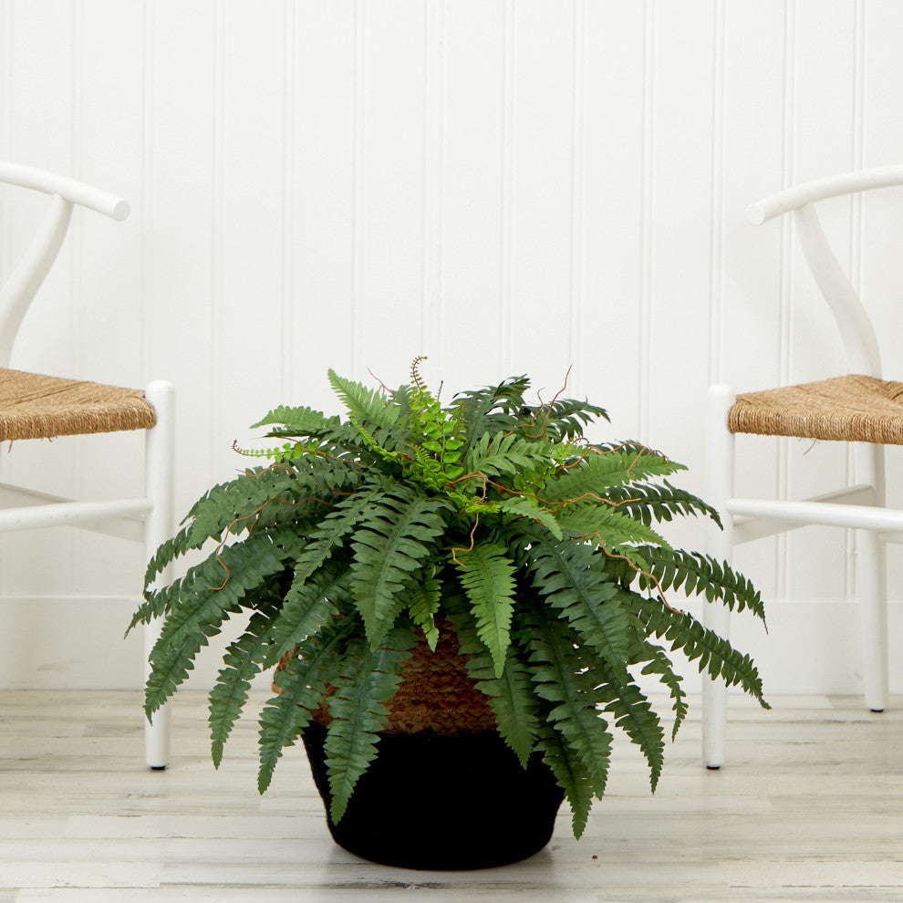 No need to venture deep into the jungle to bring a lush look into your home! Our NEW Artificial Boston Fern DIY Kit is here to help you do just that. Made from premium materials by expert horticulturists, this fountain of green leaves sprouts to create an overgrowth of greenery that will add some serious visual interest to your space, all without maintenance. With ruffled, textured, and long leaves, this piece provides a verdant touch that makes it look even more lifelike. Plus, you can shape the branches as you see fit, making it the perfect fit for your space. The handmade jute basket adds an organic touch and enhances the silhouette, much like a tree trunk. This DIY kit comes with everything you need to create the most lifelike home decor item you''ve ever seen, and it takes just 5 minutes or less to bring your vision to life. It''s a perfect family activity and makes for a great gift for your loved ones, no matter their age or occasion. So, what are you waiting for? Get that lush jungle look in your space today and transform it into a green oasis! With this Artificial Boston Fern DIY Kit, you''ll have all the jungle vibes you need to bring your home to life. Includes: Basket, Faux Tree, Rectangular Cardboard, Styrofoam, Spanish MossDifficulty: Perfect for beginnersEstimated time: 5 minutes or less1. Remove the plastic from the faux tree, then insert the trunk into the middle of the larger part of the Styrofoam until it feels sturdy. 2. Add the Styrofoam into the cardboard box, you"™ll want it to be at the same surface level of the box. 3. Add the cardboard box with the faux tree inside the basket, and make sure the box is centered in the basket. 4. Once centered, add your Spanish moss, and remember to stretch it, so it covers the interior diameter of the basket. 5. Shape your tree by bending down the branches and then fluffing all the leaves6. Enjoy your new faux tree, made by you sit back and admireDesigner tip: Before decorating with moss, add fillers such as rocks, newspaper, or paper packs for an elevated look and stability. Designer tip: Steam the leaves for a more realistic look. Cleaning tip: Keep your tree looking beautiful for years by feather dusting the leaves and basket once a month.