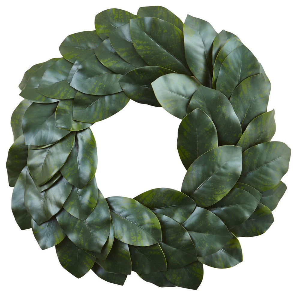 Want to do something a little different Then display this interesting magnolia leaf wreath, and watch people gaze at it and say "wow, that''s really cool". The leaves circle round and round, and are layered almost like armor, giving this wreath a one of a kind look. Best of all, it''ll never dry out, meaning it will be eliciting comments for years to come. Also makes an interesting gift.