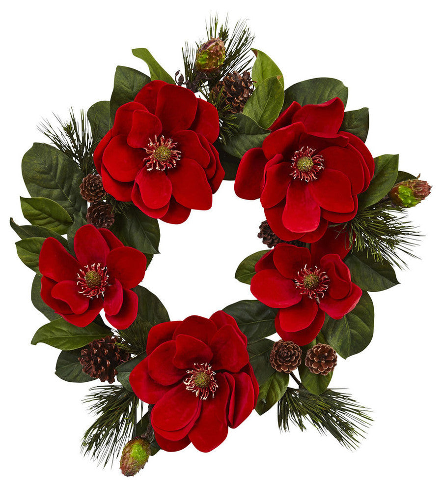 Just in time for the holidays, this wonderful Red Magnolia and Pine wreath makes for an ideal decoration. At a full two feet in diameter, it''s large enough to make a real statement, and the red and green colors simply pop. Adorned with realistic-looking pine cones, this wreath will become your favorite home or office decoration for years to come.