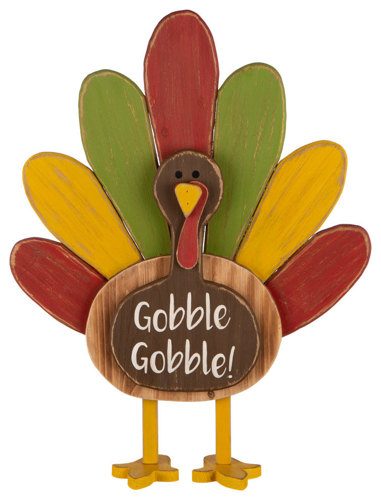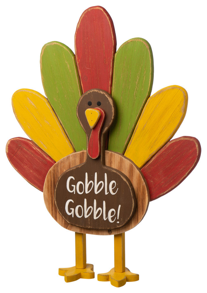 Its a standing turkey for thanks giving. The turkey made of MDF. The turkey features wooden legs and colorful tail.It is write "Gobble" in white on the body.This charming pieces look great anywhere, whether set along your dining room table or on the living room mantel.Wood turkey with colorful wingsKD Foot, simple assembly is requiredThe painted turkey sounds of "Gobby Gobby" like a welcome sing to your friends in Thanksgiving holidays