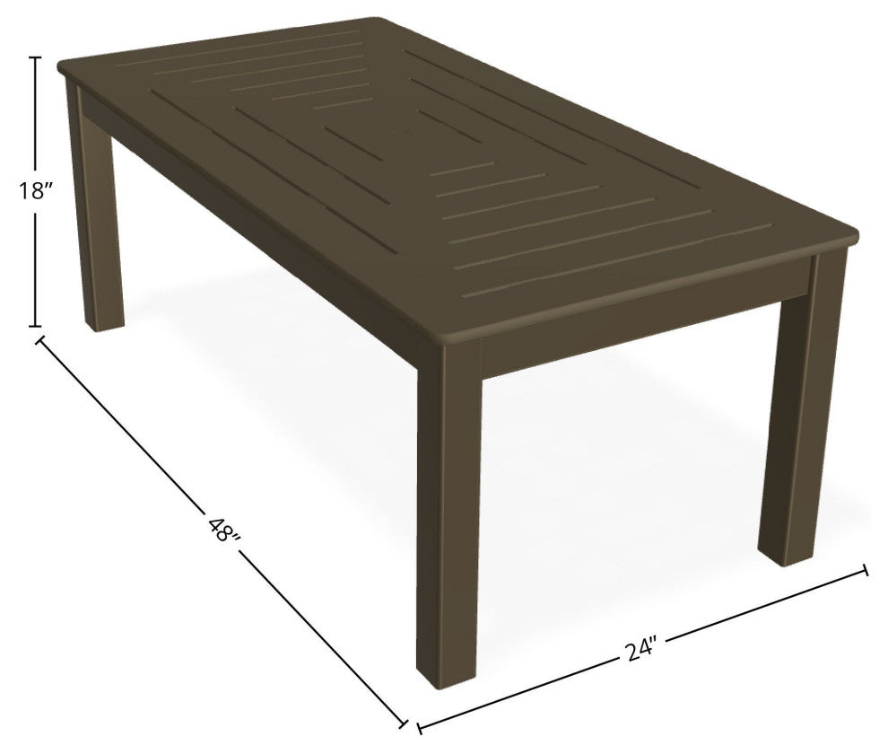 Marine Grade Polymer Top Tables combine modern design with unmatched durability for outdoor living. With options in coffee, chat, dining, accessory, balcony, and bar heights, they offer versatility for any setting. Sleek lines and sharp angles create a clean, contemporary look, while marine-grade polymer surfaces resist cracking, rotting, and water damage. Built to last, these tables are a practical and stylish choice for outdoor spaces.Features:•  Overall product dimensions are 24" W x 48" D x 18" H•  Marine-grade polymer resists cracking, rotting, and water damage, inside and out•  High-quality 100% stainless steel hardware•  Available in multiple color variations•  Proudly made in the USA with over a century of craftsmanship since 1903Dimensions:Coffee Table•  Assembled Product: 24 inches wide x 48 inches deep x 18 inches high•  Weight Capacity: 350 pounds