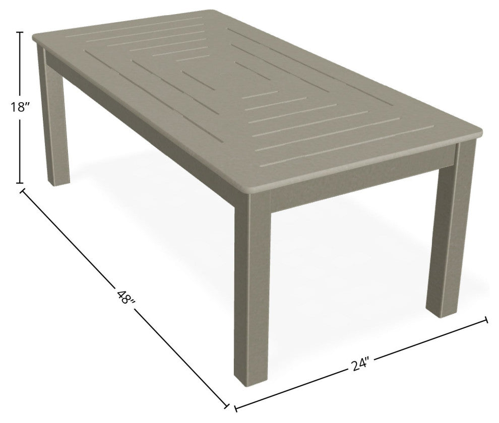 Marine Grade Polymer Top Tables combine modern design with unmatched durability for outdoor living. With options in coffee, chat, dining, accessory, balcony, and bar heights, they offer versatility for any setting. Sleek lines and sharp angles create a clean, contemporary look, while marine-grade polymer surfaces resist cracking, rotting, and water damage. Built to last, these tables are a practical and stylish choice for outdoor spaces.Features:•  Overall product dimensions are 24" W x 48" D x 18" H•  Marine-grade polymer resists cracking, rotting, and water damage, inside and out•  High-quality 100% stainless steel hardware•  Available in multiple color variations•  Proudly made in the USA with over a century of craftsmanship since 1903Dimensions:Coffee Table•  Assembled Product: 24 inches wide x 48 inches deep x 18 inches high•  Weight Capacity: 350 pounds