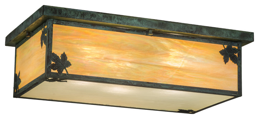 Delicately etched of Solid Brass, graceful Maple Leaves accent this stunning oblong fixture. Handcrafted of Beige Iridescent art glass with Frosted Rain Glasson the bottom diffuser, this fixture is enhanced with decorative accents and hardware featured in a Verdigris finish. The Craftsman Signature piece is created by Meyda artisans at the foothills of the Adirondack Mountains. Custom sizes, styles, colors and dimmable energy efficient lamping options are available. UL and cUL Listed.