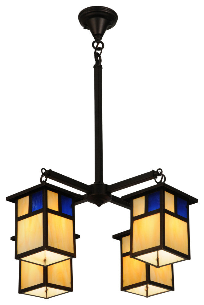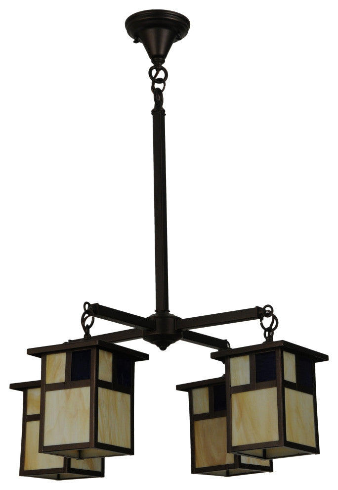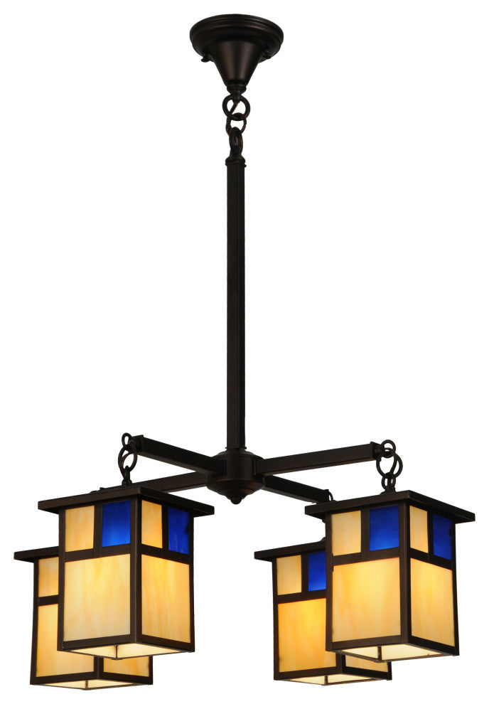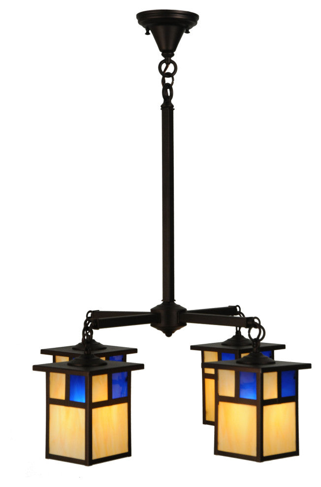 Mission stylized lanterns are designed in stunning Beige with Blue accent art glass with a minimalist geometric design on this four light chandelier. Perfect for residential, retail and hospitality applications the hardware is hand finished in a Mahogany Bronze powder coat. This stunning fixture is the perfect complement to any decor. Handcrafted by Meyda artisans at the company''s manufacturing facilities in Upstate New York. Custom sizes, styles and colors available. Energy efficient lamping options.