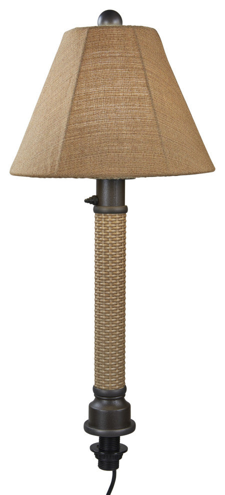 Patio Living Concepts 26-784 Umbrella Table Lamp 26784 with 2" mocha cream wicker and bronze tube body, straw linen Sunbrella shade fabric. Add fashionable styling and light to your outdoor dining table. Features all resin construction and fits 1 7/16" diameter or larger umbrella table hole. Accommodates table thicknesses up to 3". Acrylic waterproof light bulb enclosure allows the use of a standard 60 watt light bulb or comparable LED or CFL bulb. Complete with on/off dimmer switch and 14 ft. weatherproof cord and plug. Dimension: 14Lx14Wx28H in.
