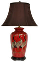 Bold oriental lamp featuring an antiqued red lamp body decorated with hand painted Japanese cranes and a high-gloss over glaze. Lamp includes the dark Rosewood base, sateen shade, and ceramic finial as shown. Wired to UL approved specifications and uses standard American size incandescent or eco-friendly compact fluorescent light bulbs.
