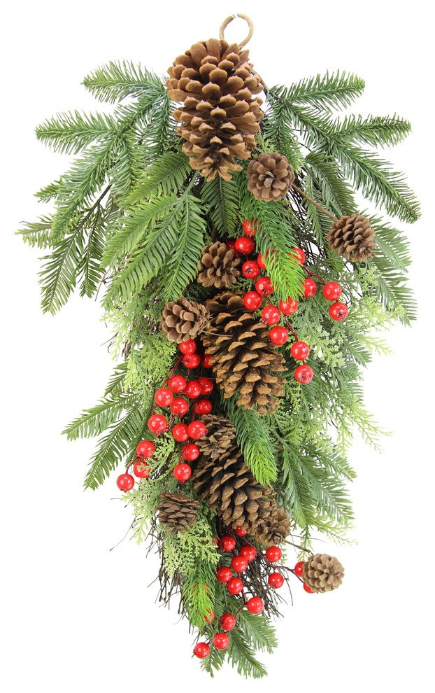28" Faux Red Berries, Natural Pine Cones and Cedar Christmas Teardrop