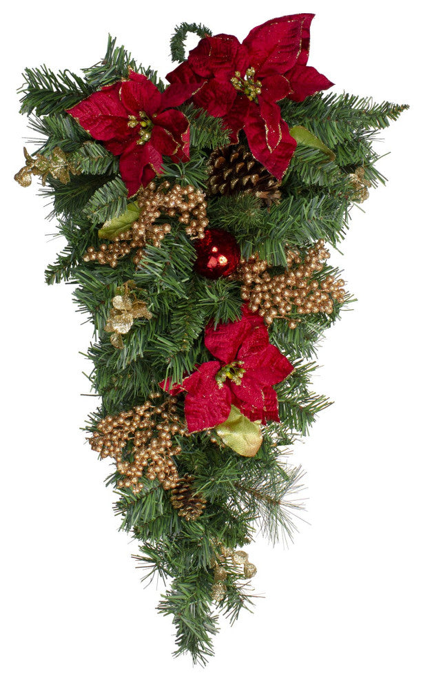 28" Pine with Red Balls Poinsettias Gold Pine Cones and Berries Teardrop Swag