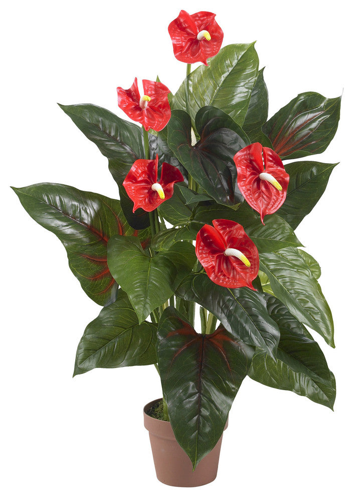 Those red pursed lips, floating on a sea of lush greenbreathtaking!!! Ok, maybe we''re getting a bit carried away. But then again, maybe not. Just look at this specimen, and you''ll see that our opening statement makes perfect sense. This Anthurium plant stands a full 3tall, and is both lush and alluring at the same time, with large green leaves and full red blooms. And because it''s part of our ''Real Touchline, it feels just as good as it looks!