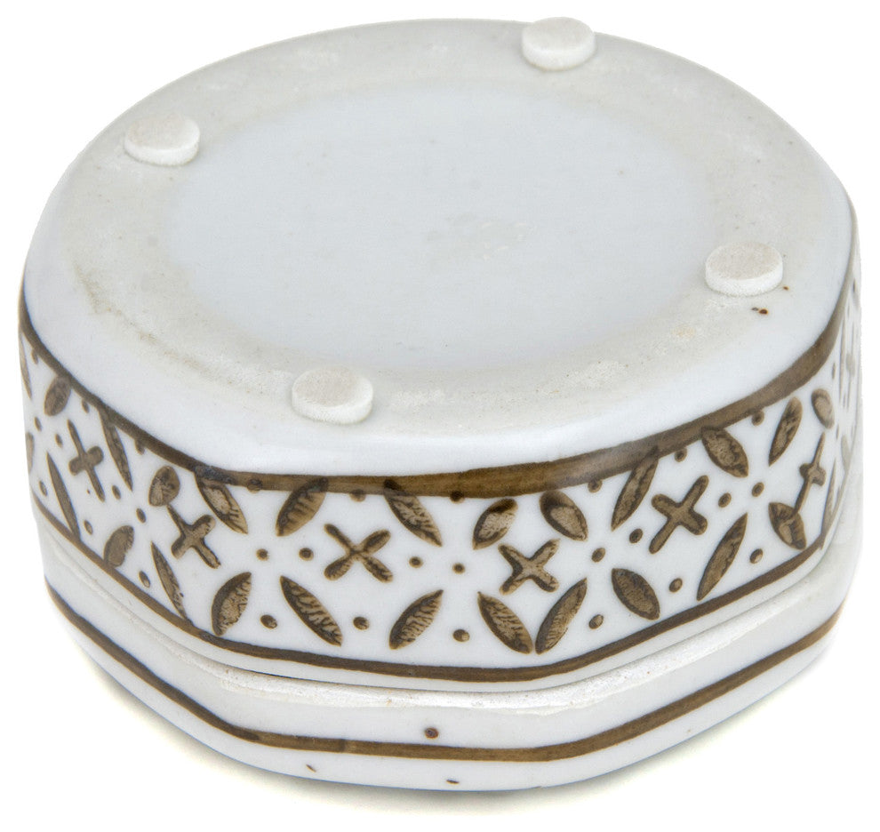 This beautiful trinket box is made from fine white porcelain and hand painted in golden-brown with traditional Chinese designs. A perfect place to keep jewelry, mementos, and other small valuables, this porcelain box would make an ideal present for a loved one.