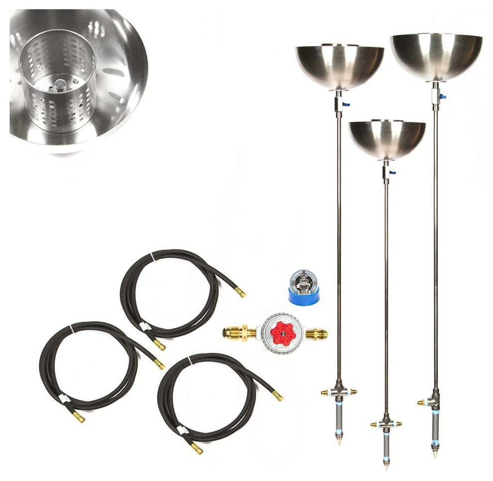 (3) portable propane 72"stainless steel tiki type torches w/ all except lp tank; model torch72b4bck-3pk(the pictures attached do not show this entire kit; it shows varied sizes; also the bowls are missing from the parts view - 3 double sets of bowls)DIY (3) 72"portable propane tiki torches; complete kit w/ bowls, hoses & fittings; ready to hook to your tank and light with minimal assembly.Burner, bowls, mounting kit, tank connection, var hi-out regulator, 12'' between torches and tank is 12'' from either end torch, hoses & all fittings; torch72-b4bck-3pk: this kit comes with:(3 sets) 4"ss316 stainless lifetime guaranteed vertical burner mounted into (2) bowls (outer 11"bowl and inner diffuser bowl) via;(6) threaded 2.5"washers(3) 1/2"female x female (fxf) stainless ball valve(3) 72"tall stainless nipple/ rod(1) efp custom modified tee; fxfxf(3) 6"galvanized 1/2"nipple(3) 1/2"pointed cap(5) 3/8"flare x 1/2"male brass fitting(3) 12'' flexible 350 psi propane/ (1 psi canada nat gas) hose(1) 3/8"flare x 1/4"male brass fitting(1) high-output adjustable 0-10 psi propane regulator(1) p.o.l. soft nose propane tank connection valve(1) 250"roll of monster ptfe tapeThis regulator works with propane and does not work with natural gas. The hoses, fittings and everything but the regulator will work with natural gas.Burners and Rings: all of our burners and rings are made of the highest quality ss316 marine grade non-magnetic stainless steel. the same stainless you see on cruise ships, not lessor ss304tool or grill gradestainless 90 percent of other companies produce. easy fire pits. Burners are made to last for not just your lifetime, but that of your kids! and we put that guarantee in writing. see our works or we replace it lifetime guarantee.Our easy to work with burners and parts allow anyone to make a personal, artsy, yard or table enhancing fire feature; one that can be altered and customized, re-used from home to home, or brought from party to party. Our complete kits are made of straight forward parts; easy enough for most amateurs to use, and yet a dream for any DIY (do it yourself) or professional fire feature builder. We look forward to your orders and know you will enjoy our products for decades to come. Once you make one for yourself, remember, our kits make great gifts!
