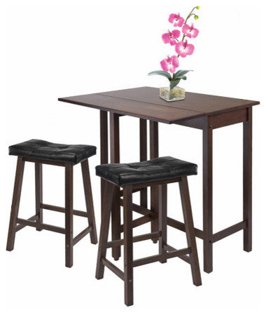 This 3pc set is versatile high table is space saving and functional. A leaf is folded down for space saving and when in use lift up the leaf for an extension of top surface. Top table area when leaf is up 39.37"W x 30"D x 35.43"H. Table when leaf is folded 39.37"W x 20.70"D x 35.43"H. Drop leaf 39.37"W x 10.31"D. Constructed in solid wood in warm Antique Walnut Finish. Ready to Assemble.
