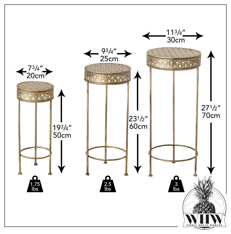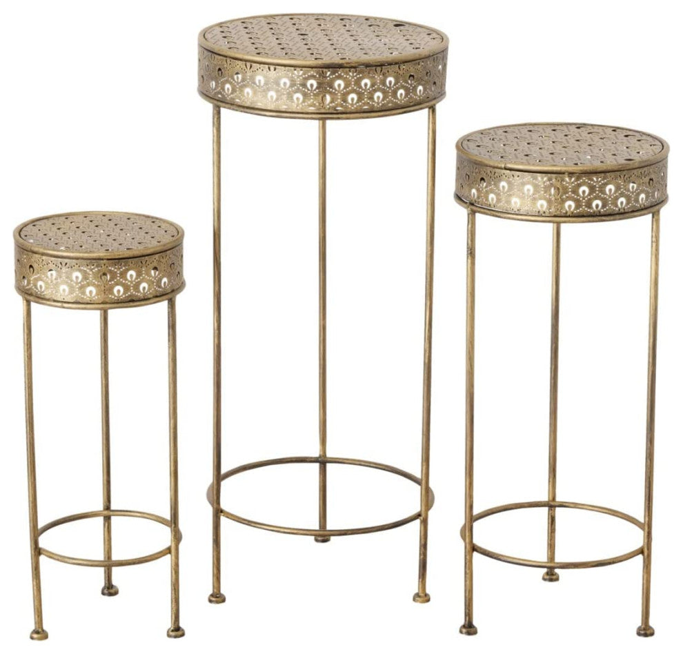 Let your plants stand tall and showcase your potted greenery, with these paisley plant stands. Sold as a set of 3, this detailed set of tables nests together for compact storage and features beautiful intricate metal work. Crafted of durable antique gold iron and finished with a whisper of vintage style patina.