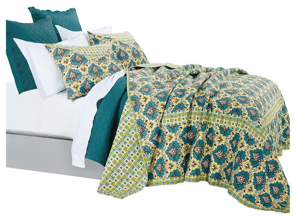 Wash Instructions: machine wash cold, gently cycle, only non-Chlorine, bleach, when needed, tumble dry low, Iron at lowest setting if neededMachine Washable: YesSet Measurements: Quilt: 92x96, Pillow sham: 20x26"Set Includes: 1 Quilt, 2 Standard shamNumber of Shams: 2Sham Size: 21• 27" Pieces: 3Materials: Quilt: Face: 100% Cotton, Back: 100% Cotton, Filling: 80% Cotton, 20% Rayon; Standard Sham: Shell: Face: 100% Cotton, Back: 100% Cotton, Filling: 80% Cotton, 20% Rayon