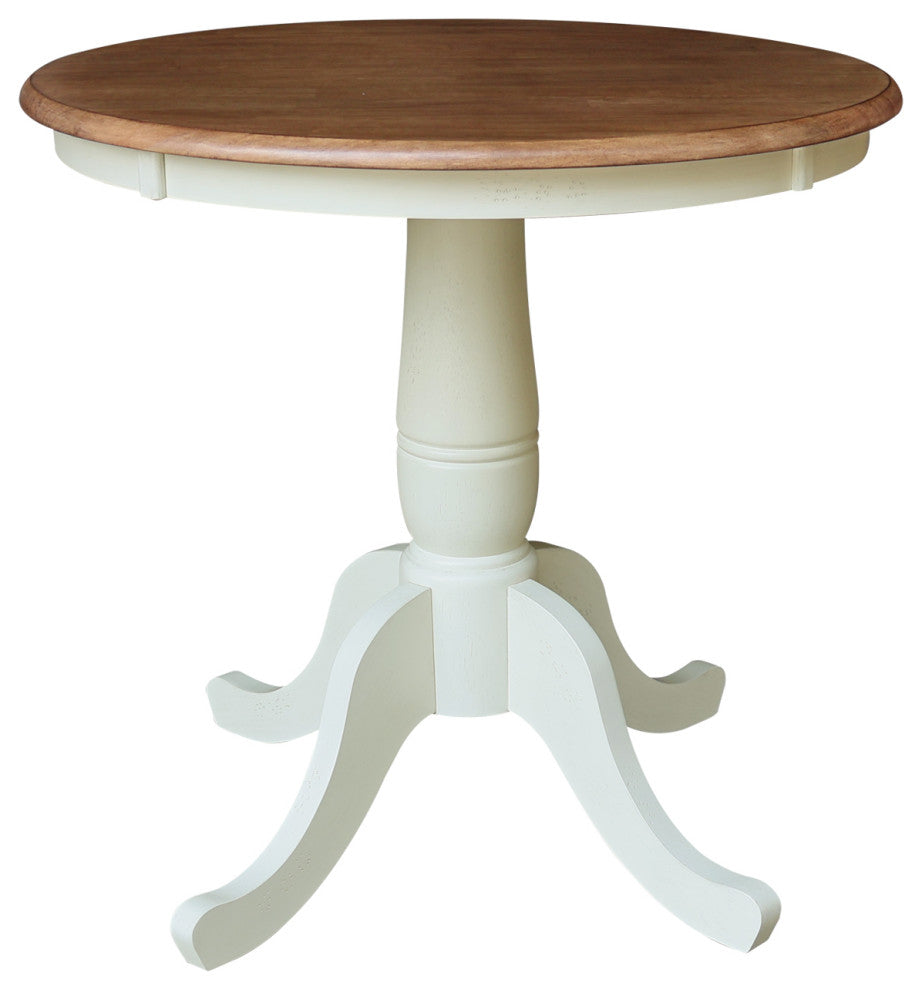The sleek style of this fixed dining table from International Concepts is the perfect addition to your kitchen, dining room or breakfast nook. This traditional table is crafted from solid wood and is part of a high-quality collection of wood furniture that will easily complement any dcor. Parawood a hardwood known for its durable, strong, and environmentally friendly nature is used to craft these classic tables. The table anchors a room as a strong centerpiece, and pairs well with a wide variety of chairs and stools from International Concepts. Whether you prefer to use it for nightly dinners, or working quietly on a hobby, this table gives you the practicality as well as the style you need. Invest in this exceptional 3-piece dining set, which includes a durable solid wood table and two stools, perfect for any dining space!This piece is constructed using solid parawood, which is highly recognized for its remarkable sturdiness and longevity.Table Dimensions: 30"W x 30"D x 35.1"HStool Dimensions: 17"W x 19"D x 38.8"HSeat Dimensions: 16.9"W x 16.8"D x 24"HWith a weight capacity of 225 pounds, you can rest assured that this product is both sturdy and reliable, providing you with the peace of mind you need.Enhance stability with the included pedestal base featuring four feet for maximum support.Distance from top to bottom of apron: 2.5''''HAssembling the product has never been easier! You can put it together quickly and hassle-free with all the necessary hardware included.Not rated for commercial use, for residential use only