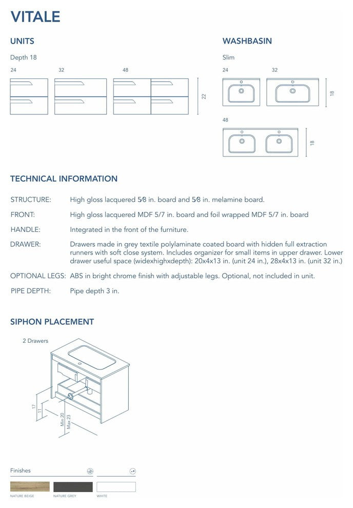 SET INCLUDES: Standing Bathroom Vanity + Pure White Ceramic Basin.5 YEAR WARRANTY: Designed and manufactured in Spain.READY TO INSTALL: Pre-assembled cabinet. Standing Design. Environmentally Friendly. CARB2 Certification approved.SOFT-CLOSE DRAWER SYSTEM WITH PARTIAL EXTRACTION FOREASY STORAGE: Includes organizer for small items in upper drawer. Lower drawer useful space. Metallic bright chrome finish handles.Drawers made in grey textile polylaminate coated board with high quality hidden parcial extraction runners with soft close system.WALL HANGING BRACKET: Hidden hanging brackets with direct assembling system, great resistance and depth regulations. METALLIC LEGS. In bright chrome finish with adjustable system included in unitPRODUCT SIZE:Vanity Size: L: 32" W: 18" H: 23" inches.Basin Size: L: 32" W: 18" H: 3/4" inches.Adapts to your pace of life. VITALE reflects the dynamism and vitality of people who lead an active, on-the-go lifestyle. Every detail counts towards giving you the best experience and making the most out of each space.NOTES.PIECES INCLUDED ONSET:- Standing Vanity (Soft Close Drawer System)- Ceramic Basin (Pure White)- Wall Mount Metal Brackets & ScrewsDOES NOT INCLUDED:- FaucetThe photo is for display only, actual color may varyProfessional Installation Required: Yes