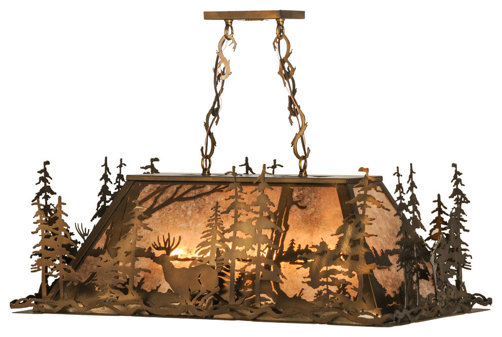 Rustic charm is captured beautifully with this striking pendant fixture design of young bucks leaping through the trees in the woods. Warm lighting is created by a stunning Silver Mica shade enhanced by the decorative accents, frame and matching hardware finished in Antique Copper. Use as a pendant over counters, kitchen islands, dining or billiard tables. Handcrafted in the Meyda manufacturing facility, located at the foothills of the Adirondack Mountains. Additional wildlife and custom designs available, as well as energy efficient lamping options