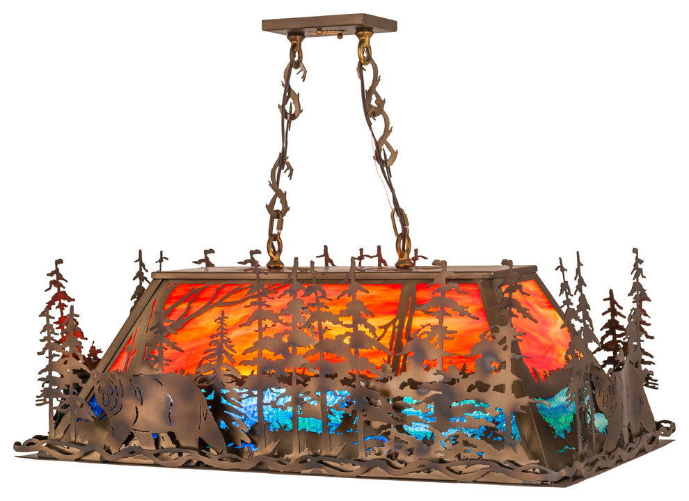 Drawing inspiration from the wildlife and natural beauty in the nearby Adirondack Mountains, this stunning pendant depicts a majestic Bear wandering among the pine trees around a woodland lake. An ambient glow projects through the stunning art glass shade, which features an Orange sunset sky and sparkling Blue-Green water. The shade is complemented with a frame and hardware featured in a Burnished Antique Copper finish. The pendant, which is ideal for illuminating islands, counters and billiard tables, is handcrafted by Meyda artisans in our Yorkville, NY facility. Custom sizes, styles, finishes and dimmable energy efficient lamping options are available. The pendant is UL and cUL listed for damp and dry locations.