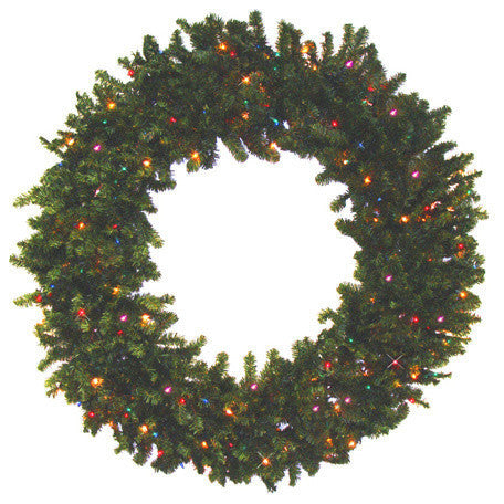 Product Features:Two-tone medium green foliage380 tipsPre-lit with 150 multi-color LED lightsMulti-color consists of red green blue pink purple and orange bulbsBulb size: concave wide angle (mini bulb)No assembly required - wreath comes in 1 pieceIncludes a heavy duty double ring metal frame backing for hangingAdditional product features:Flame retardantLED lights use 90% less energySuper bright bulbsIf one bulb burns out the rest will stay litLights are equipped with Lamp Lock feature which makes them replaceable interchangeable and keeps them from falling outRequires 3 "AA" batteries (not included)On/off switch on battery packFor indoor use onlyComes with replacement bulbsDimensions: 36 inch diameter (measured from outer tip to outer tip across the wreath)Material(s): PVC/metal/plastic bulbs/wire