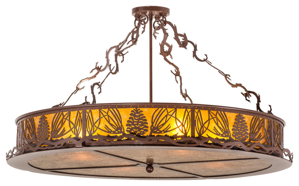 Mother nature comes to light as Mountain pinecones and pine needles are featured on this unique nature inspired ceiling fixture. The charm of the forest comes alive with soft warm ambient light emanating through Amber Mica that is accented by hardware and accents featured in a Rust finish. The fixture is perfect for hallways, entryways, foyers and other rooms where you want to make a stunning design statement. The fixtures handcrafted by Meyda artisans in our manufacturing facility, at the foothills of the Adirondack Mountains. Custom sizes, styles, colors and dimmable energy efficient lamping options are available.