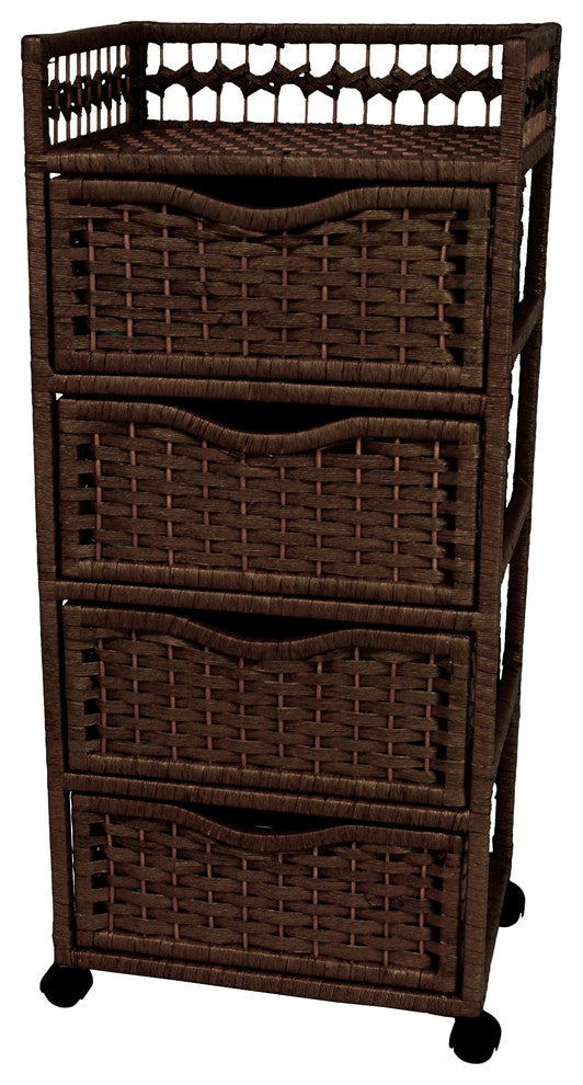 Introducing a chest of drawers that brings together classic woven design and practicality, now equipped with convenient wheels. The meticulously spun plant fiber cord, intricately woven with dyed wood doweling, showcases a timeless, handcrafted allure that seamlessly bridges traditional and modern aesthetics. The vivid hues create a captivating interplay between rustic simplicity and refined elegance. Its capacious, lined drawers offer an abundance of space for arranging stationery, craft supplies, and beyond. Arriving fully assembled, this versatile piece effortlessly finds its place in dorms, bedrooms, or studios, infusing every corner with rustic charm and efficient storage. Embrace a clutter-free lifestyle and welcome organized harmony with this innovative solution that offers both style and mobility.Lined drawers - Spacious removable drawers sized 14"W x 10.25"L x 6"H house your essentials while maintaining a neat and clutter-free environment. The thoughtful lining adds an extra layer of protection to your belongings, ensuring they stay in pristine condition.Additional Top Storage - Elevate your organization game with the added bonus of extra storage space on the top shelf. Enhanced with a protective railing, this top shelf spans 15.5 inches in width, 12 inches in depth, and 4 inches in height.Easy to move - Say goodbye to heavy lifting and hello to smooth maneuverability! The sturdy, reliable double wheel casters provide the perfect solution for effortlessly moving the chest without any hassle.Rustic Weave - A layered basket weave exterior of plant fiber around wooden dowels has a classic look that fits any room. The woven design not only adds visual texture but also enhances the strength of the chest, making it an ideal choice for storing your belongings securely and stylishly.Versatile Space Saver - This natural fiber chest of drawers is a compact solution that fits seamlessly into any space. Its compact size ensures it can be placed in small corners or beside furniture without overwhelming the room.Rich Color - The fiber used in this chest of drawers is dyed, not painted or stained, resulting in vivid and compelling colors. This contrast of vibrant hues with the simple and rustic design creates a unique blend of beauty and elegance.