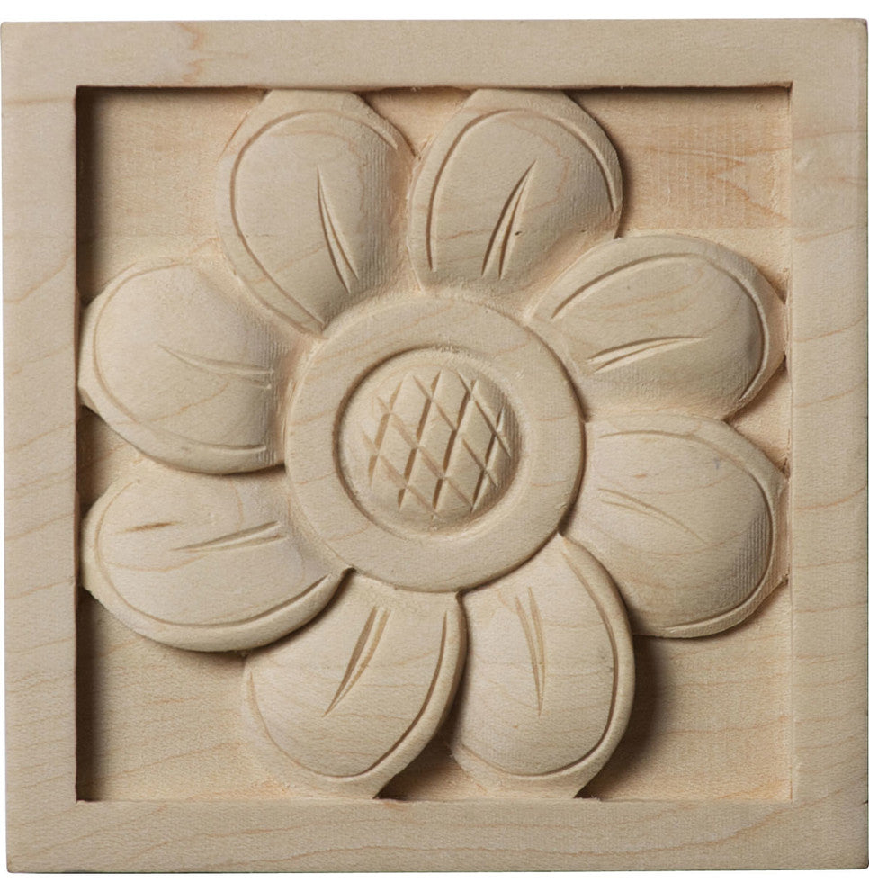 3"W x 3"H x 5/8"D Small Sunflower Rosette, Cherry. Our rosettes are the perfect accent pieces to cabinetry, furniture, fireplace mantels, ceilings, and more. Each pattern is carefully crafted after traditional and historical designs. Each piece comes factory primed and ready for your paint. They can install simply with traditional adhesives and finishing nails.