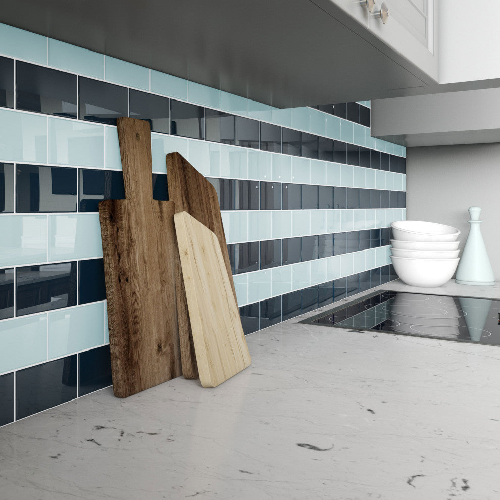 Giving contemporary style a sleek and functional design, this set of 3x6 Subway Glass Tiles brings a modern twist to any space. Their turquoise shade blends a light-reflective glass material with a water-resistant quality. This makes the high-gloss surface and block color particularly suited to providing kitchen and bathroom settings with fresh vitality.Made from glassWater resistantSquare foot coverage: 5Individual tiles: 3" x 6"Thickness: 0.31"